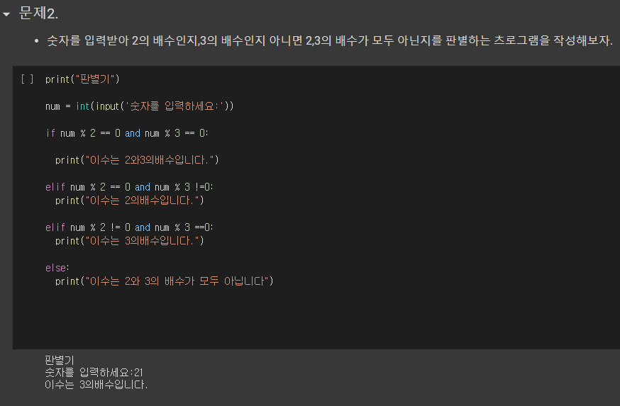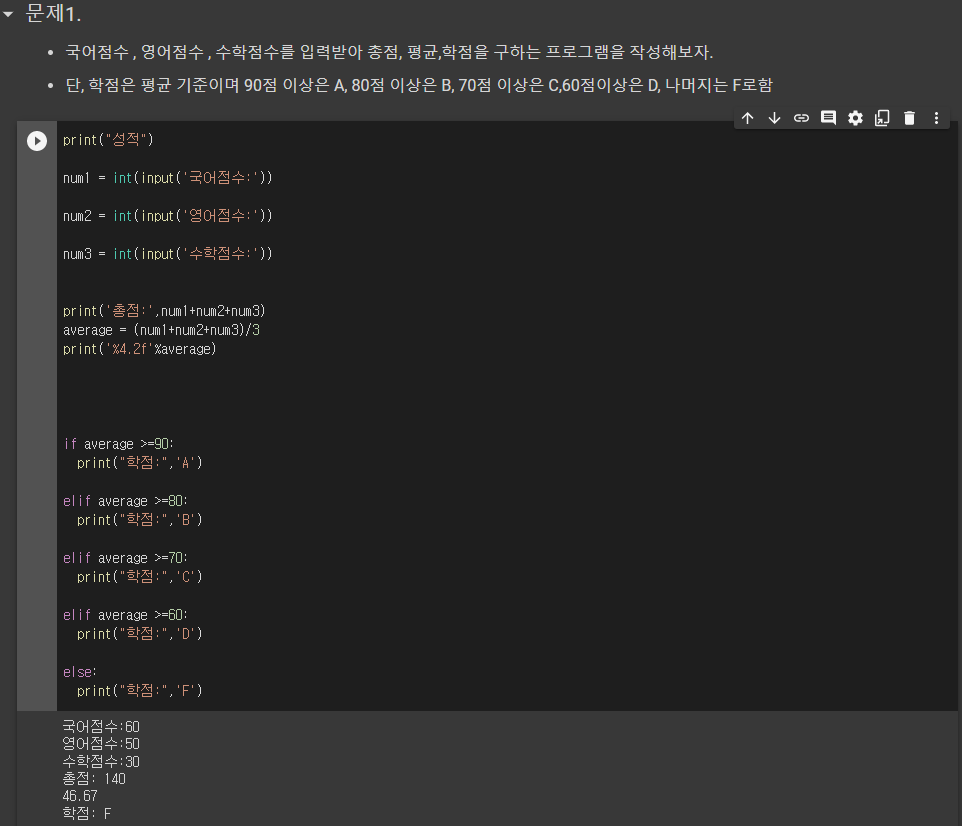 elif 문은 조건이 여러개일 경우 각각 조건에 대한 True 인 경우에 대해 실행할 문장을 설정할 수 있다.