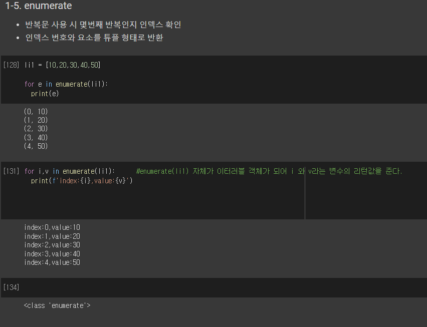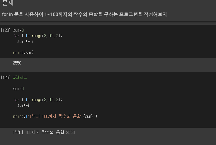 이는 변수를 이터러블 객체 의 요솟값을 리턴받고 밑에 문장을 반복 수행하는 방식이다. 이는 while 문과 기능적 차이는 없으므로 상황에 맞는 반복문을 사용하면 된다.