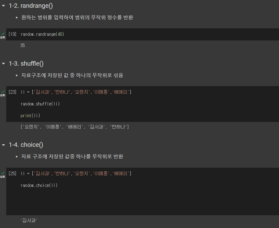 마찬가지로 random 모듈안에 있는 함수로써 원하는 범위를 입력하여 범위의 무작위 정수를 반환한다.