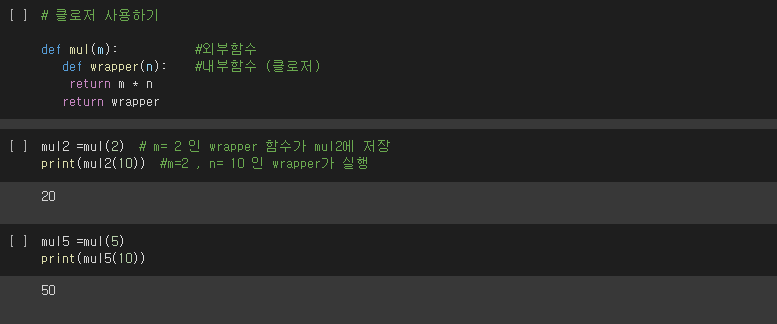 클로저와 데코레이터는 함수 자체를 고차원적으로 사용할 수 있게 해주는 역할을 해준다. 예시를 보자