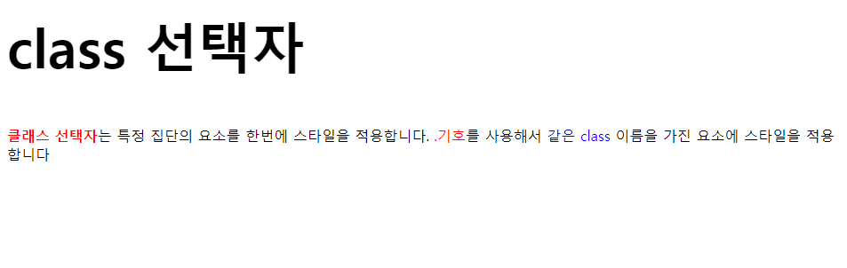 <p> <span class ="redstyle boldstyle ">클래스 선택자</span>는 특정 집단의 요소를 한번에 스타일을 적용합니다. <span class="redstyle">.기호</span>를 사용해서 <span class ="bluestyle">같은 class</span> 이름을 가진 요소에 스타일을 적용합니다</p>
