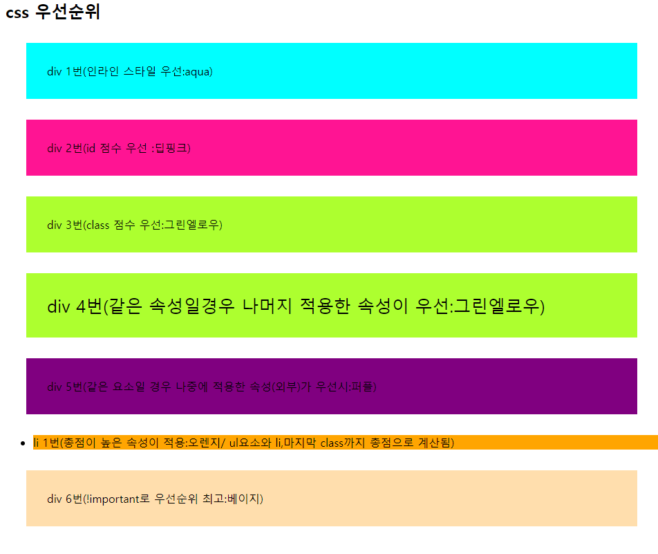 <div id="id-style2" class="class-style3">div 6번(!important로 우선순위 최고:베이지)</div>